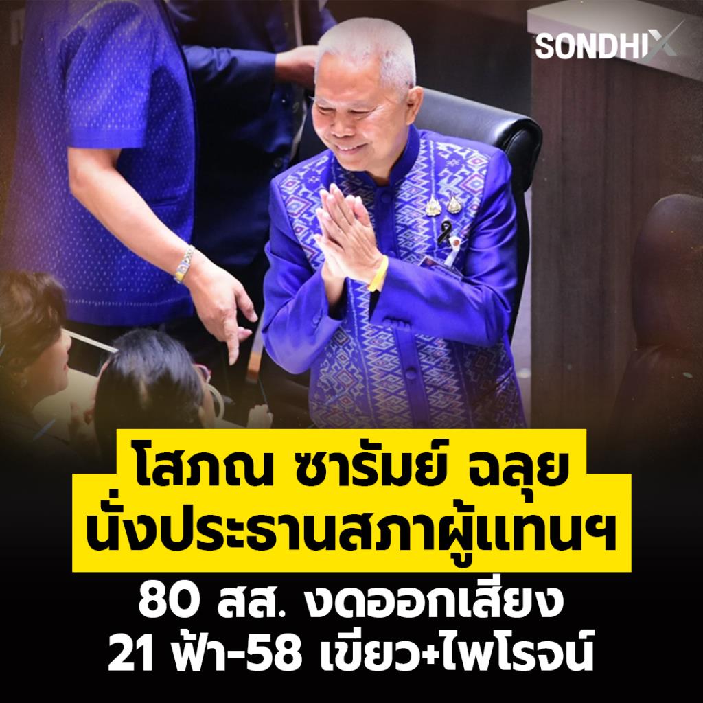 โสภณ ซารัมย์ นั่งประธานสภาฯ คนใหม่ ด้วยคะแนนท่วมท้น 289 เสียง ทิ้งห่างคู่แข่งขาดลอย ขณะที่ 80 สส. จากสองพรรคใหญ่พร้อมใจงดออกเสียง