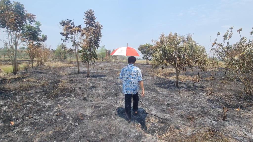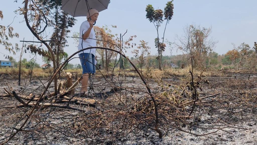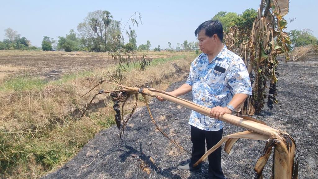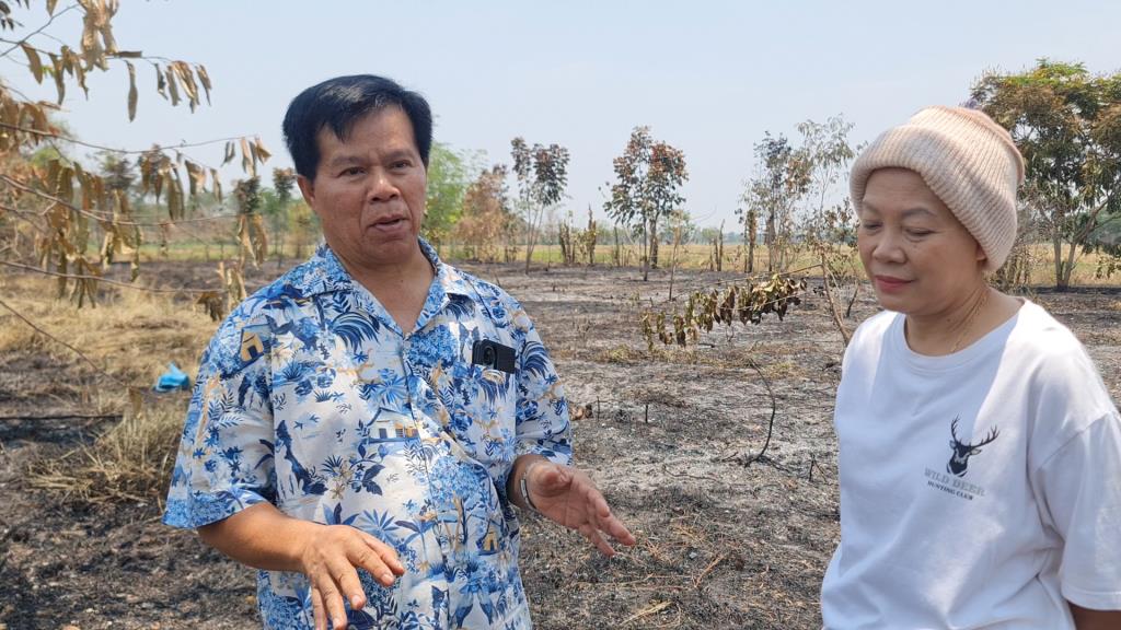 ปีที่แล้ว (2568) ชาวนาจุดไฟเผาฟาง ลุกลามไหม้พื้นที่ 2 ไร่ ทำมะม่วงตายไปเกือบ 40 ต้น พอมาปีนี้ (2569) กลับเจอหนักกว่าเดิม ไฟลุกลามไหม้พื้นที่เกือบ 5 ไร่ ทำต้นไม้ตายเกือบหมด โดยเฉพาะต้นมะริด ไม้ป่าหายาก ซื้อมาเป็นสิบต้น ราคาต้นละ 1,500 บาท ตนกับภรรยาคอยเดินหิ้วถังรดน้ำ เฝ้าดูแลมาถึง 4 ปี ตอนนี้ไม่เหลือเลยแม้แต่ต้นเดียว รู้สึกเสียดายมาก เพราะกว่าต้นไม้จะโตมันใช้เวลานาน